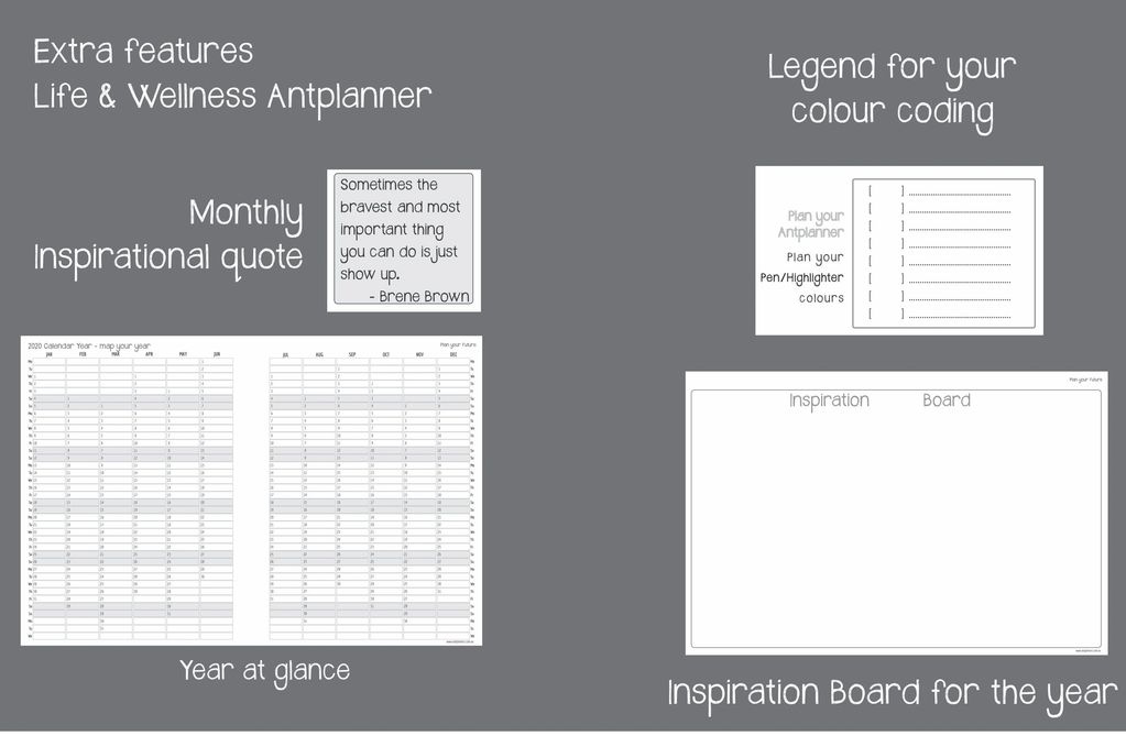 This is why this planner has some of the classic Antplanner features, like a legend and of course a yearly Inspiration Board, and the unmissable year at glance!