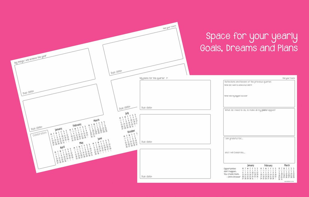 At the beginning of the planner, you will find a section that will prompt you to think about the big things for the year, and then every quarter to review, celebrate and be grateful for everything.