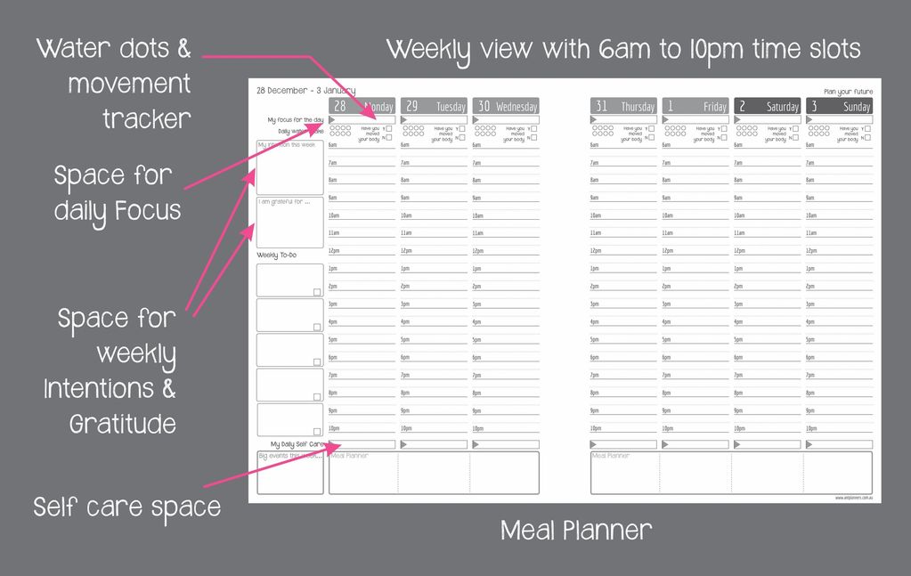 The features in this planner are designed to help you make more time for all those things that really count, while remembering to take care of ourselves not just by incorporating daily movement, or eating and drinking well, but setting intentions towards wellness and making weekly gratitude a habit.